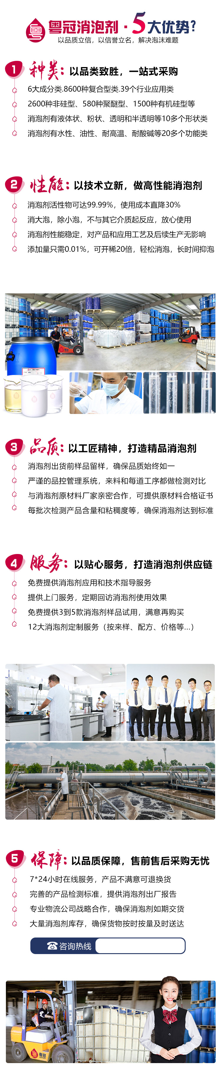 粵冠消泡劑產(chǎn)品廣泛應(yīng)用于水處理、切削液、工業(yè)清洗、印染、造紙、涂料、粘合劑,生物發(fā)酵、電廠脫硫、石油開采等38個行業(yè)領(lǐng)域,有消泡解決方案3000多種類型。產(chǎn)品有有機(jī)硅類,聚醚類,礦物油類,高碳醇類,脂肪酸類,有單體,有復(fù)合體,有透明的,有淡黃的,有乳白的各種類型消泡劑,實(shí)現(xiàn)一站式采購。